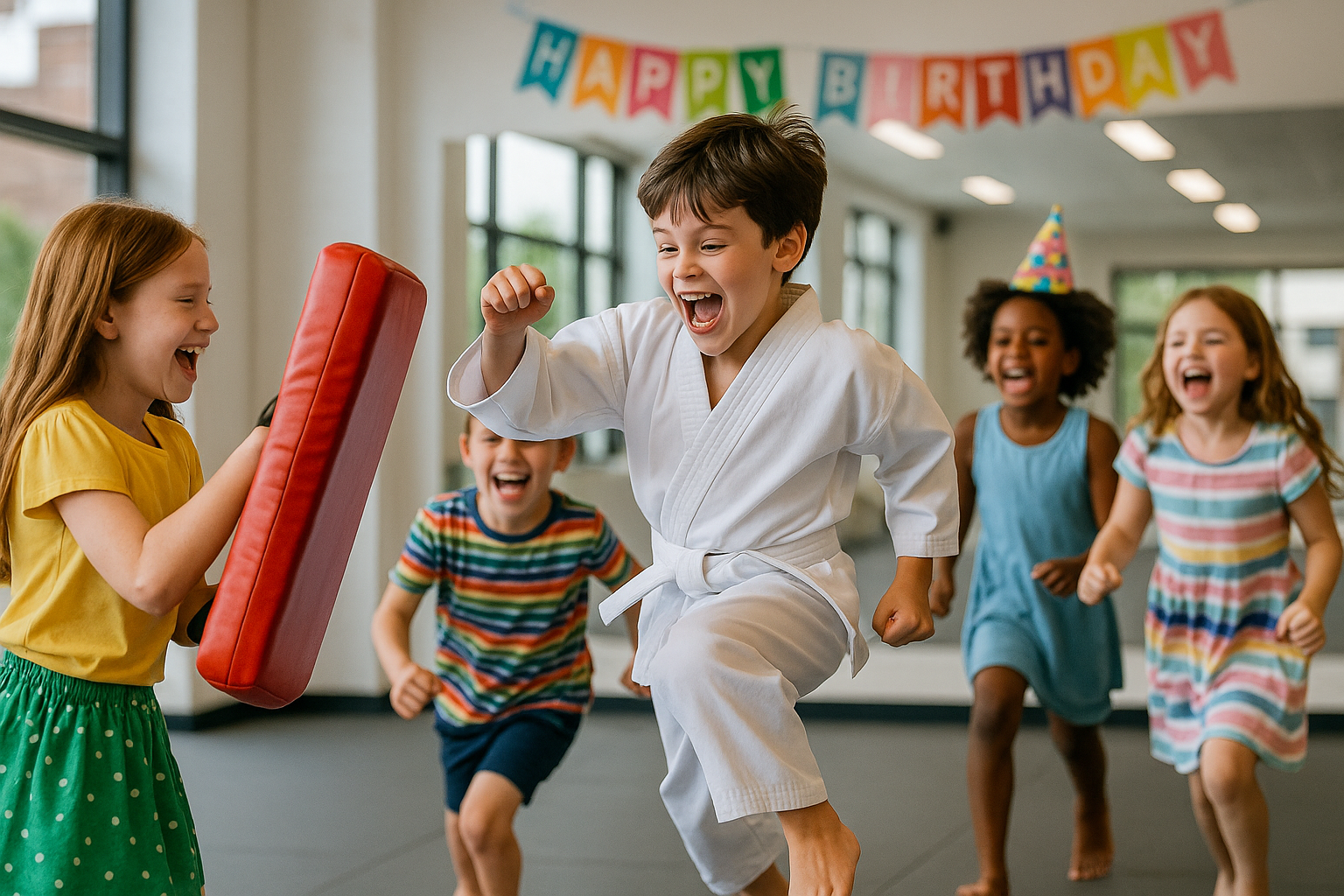 Kids run wild at trampoline parks. But at our parties? They learn, laugh, and lead — with confidence-boosting martial arts action at the center of it all.